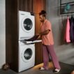 Uloženie práčky a sušičky na seba efektívne šetrí priestor. Všestranná spojovacia súprava je kompatibilná so všetkými spredu plnenými práčkami a sušičkami AEG s hĺbkou 52 až 67 cm.