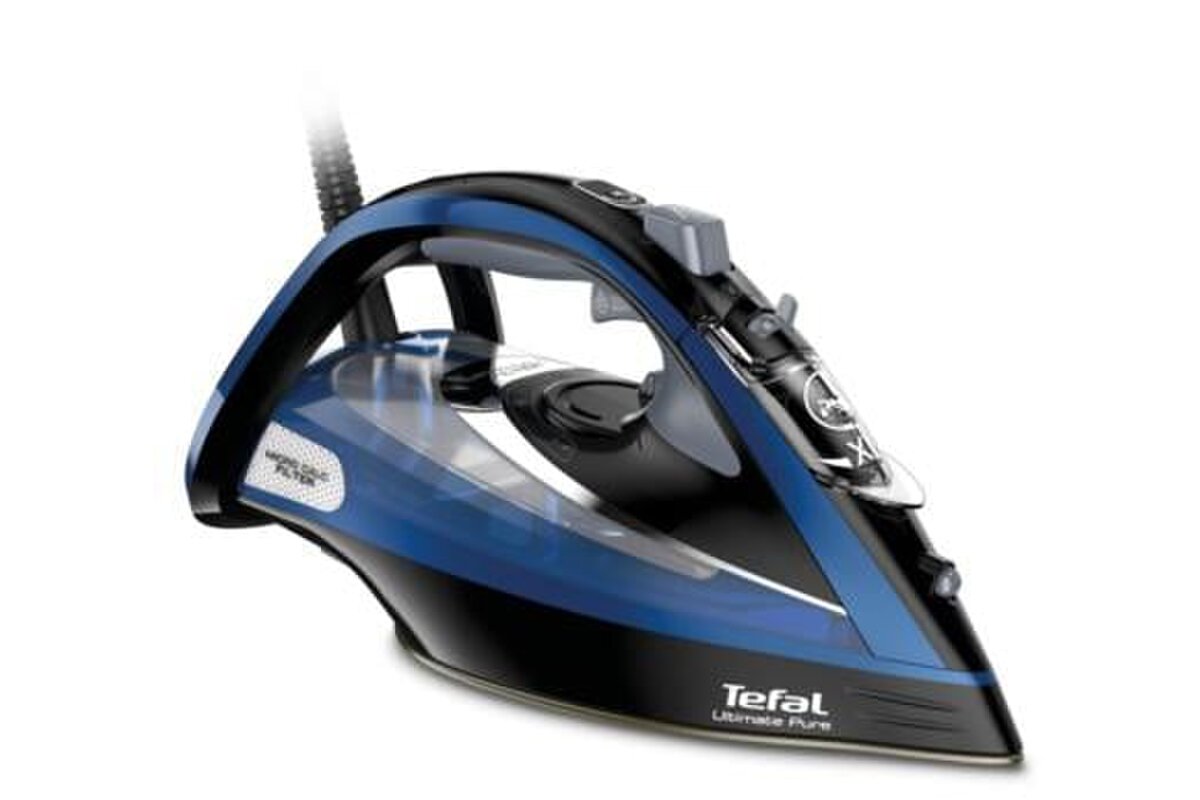 Naparovacia žehlička Tefal FV9848E0 Ultimate Pure, príkon 3200 W, parný ráz 260 g/min, žehliaca plocha Durilium AirGlide Autoclean, systém filtra mikročastíc vodného kameňa, kontinuálny parný výstup 60 g/min, kropenie, vertikálne naparovanie, automatická para, anti drip systém proti odkvapkávaniu, automatické vypnutie, dĺžka prívodného kábla 2,5 m, objem nádržky na vodu 350 ml, ergonomický spúšťač pary, upozornenie na vodný kameň, zberač vodného kameňa.